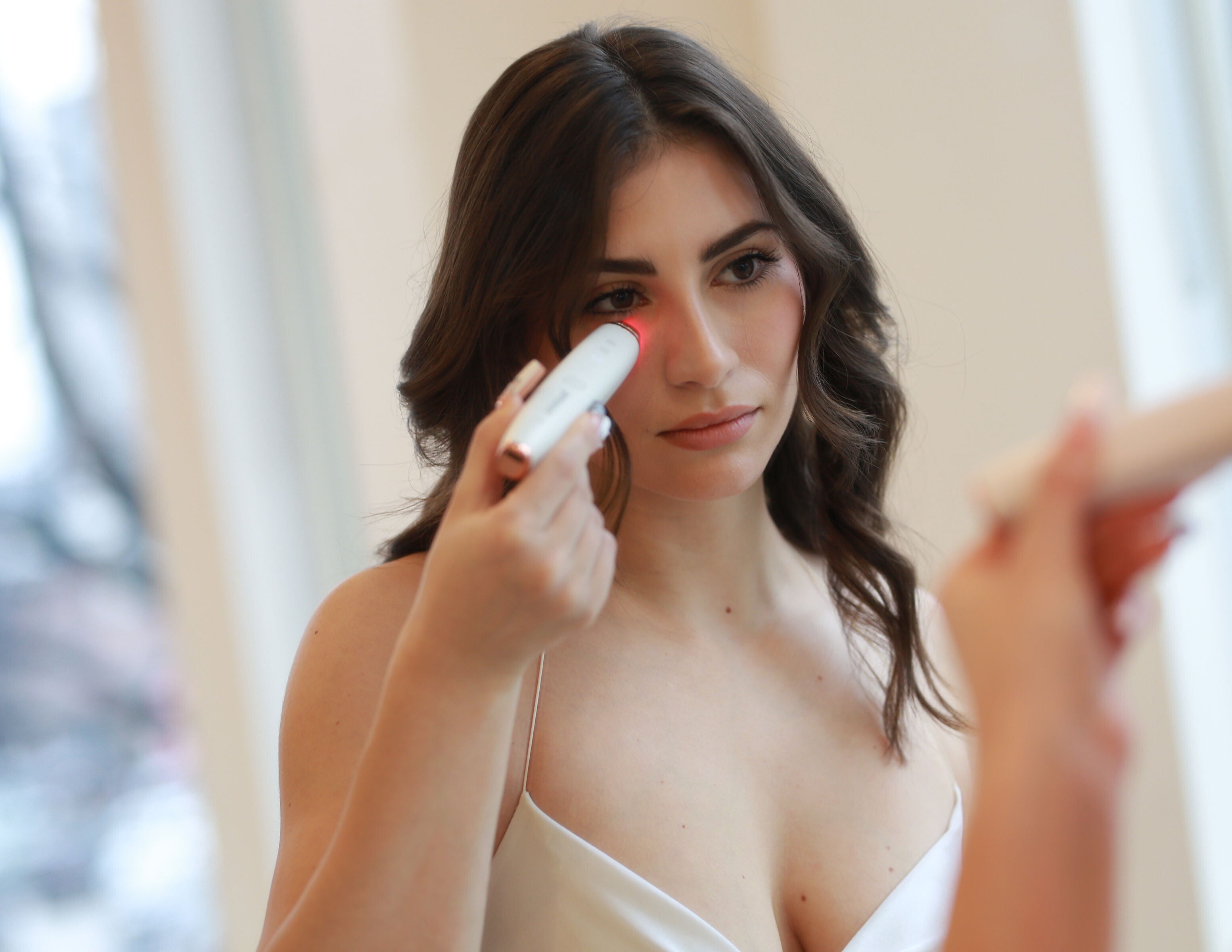 4 FDA-Cleared technologies radio-frequency (600 KHz), red light therapy (625nm), sonic vibration, and heat, work on a cellular level to stimulate new collagen, to smooth fine lines and wrinkles, brighten dark circles, de-puff, and reduce hollow eyes and eye bags.